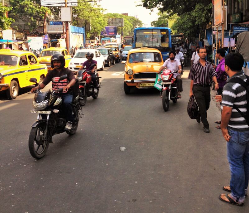 The older areas in Kolkata are crowded and chaotic, unlike the roads in New Town.