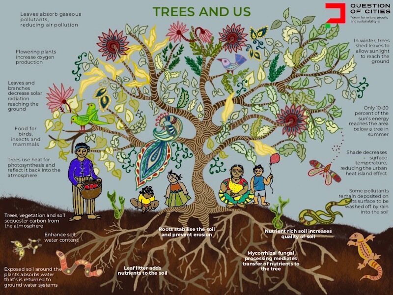 Urban design must pay more attention to a tree or trees as the new sign and symbol, not buildings. Trees provide shade, absorb carbon, release oxygen, maintain moisture levels in soil, check floods, support over half of the planet’s species underground, reduce rising temperature and help mitigate heat island effect and more. Trees also attract people to meet and rest in an otherwise stressful city life. Trees are a life force.