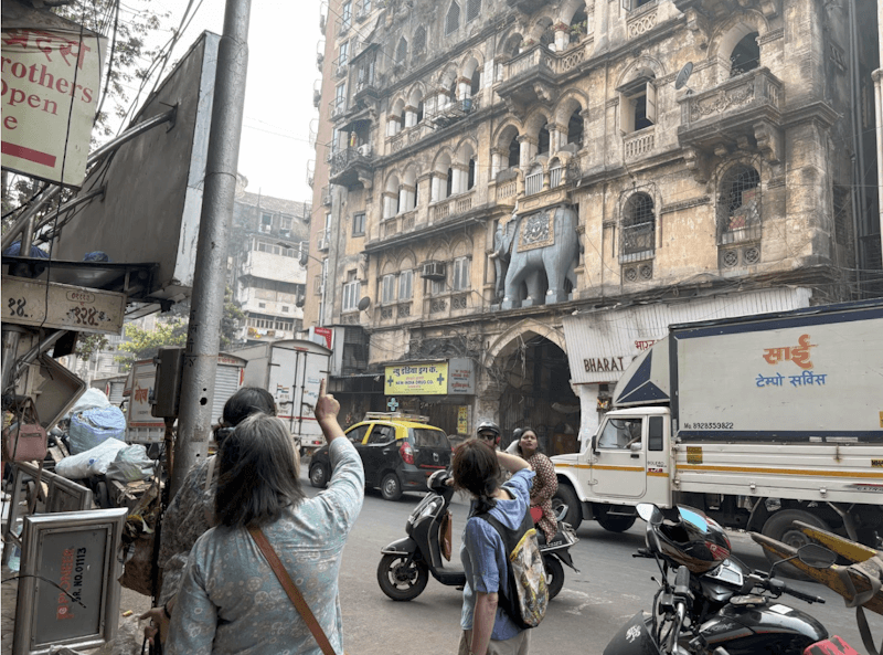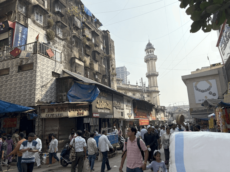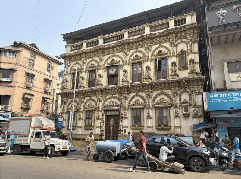 We enter the market, with Suri and Nooshian unspooling vignettes. Handcarts piled up with bales of cloth still ply the narrow streets, somewhat asynchronous with the modern gadgetry and AI use around. Tempos are lined up to transport the bales. Across the street from the MJ Market stands the Dwarkadeesh temple built in 1875 by the Halai Bhatia men who had left their families back home in Kachchh and yearned for a piece of familiar surroundings here at their place of work.