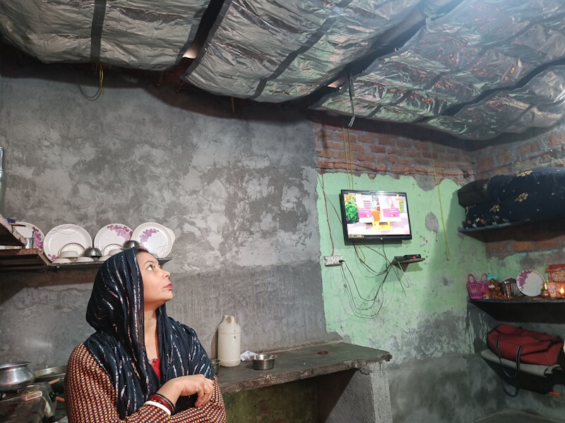 Six houses opted for a layer of dynamic barrier made of multi-layer plastic and Silpaulin sheet: two versions of it, one is a ‘Space Frame’ installed in over the roof of three houses and another is the ‘Internal Dynamic Barrier’ installed in under the roof of other three houses. These act as insulating layer, which is to be closed during day and opened during night to access the phenomena of Night Sky Radiation. Preeti (goes by first name), a home-based worker, has this system on her roof and says it has provided her some respite from the heat.