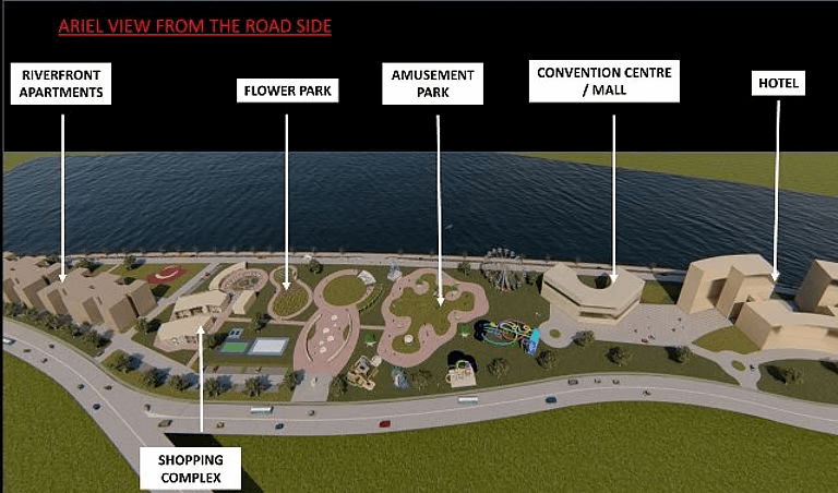The Tawi Riverfront Development Project in Jammu city was predictably meant to be a picture postcard. The thematic image below shows its claims. Along the banks of the Tawi are manicured gardens, multi-storey apartments, an amusement park, a convention centre-cum-mall, a hotel, shopping complex, a flower park, and a giant Ferris Wheel like the London Eye.