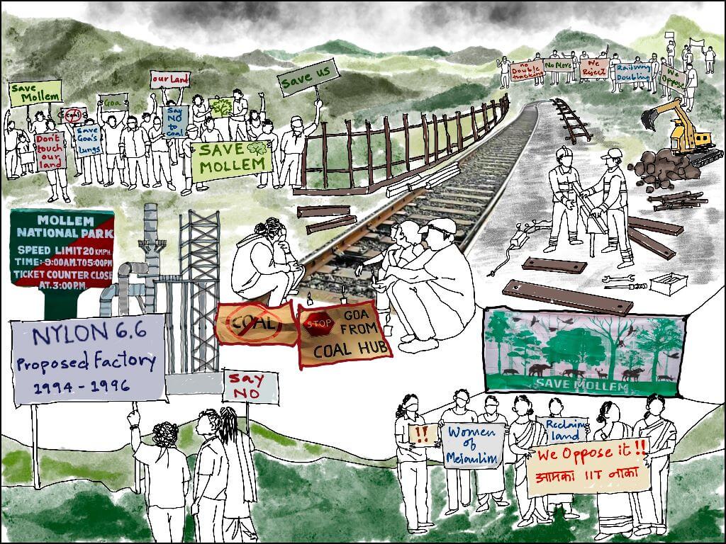 A recent landmark people’s movements to protect Goa’s land and environment have been the examples by the women of Melaulim in Guleli village[16] (North Goa) in 2020, opposing the proposed IIT on 10 lakh square metres[17] of orchard land and parts of the biosphere of the Western Ghats. The institute was opposed by villagers of Loliem and Cortali in South Goa. Then, farmers in Taleigao[18] protested the land-filling and destruction of cultivable lands for a second Panchayat Ghar. And the recent ‘Save Mollem’ campaign[19] by the Amche Mollem group sought to raise awareness on three infrastructure projects – double-tracking of railways, highway expansion, and a power transmission line and electricity substation[20] – all proposed in the protected forests of Goa.